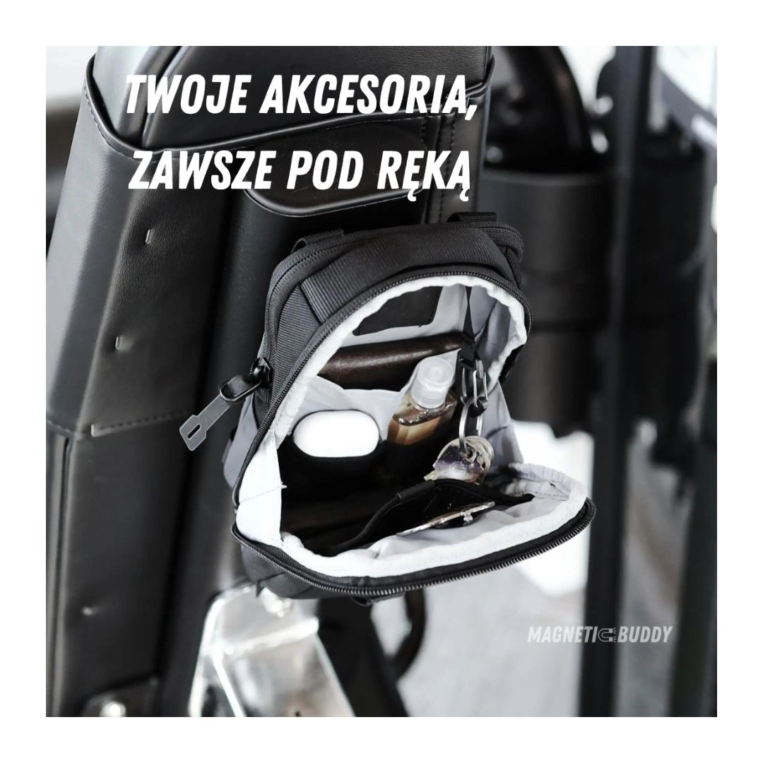 Magnetyczne mocowanie działa na wszystkich metalowych elementach. Jeśli dana powierzchnia nie jest metalowa, możesz korzystać z dołączonego paska i nosić saszetkę klasycznie.