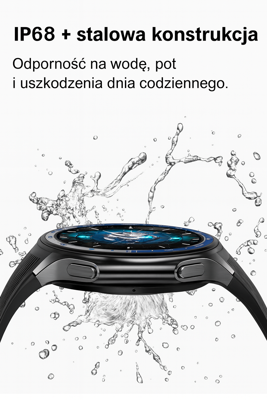 Zegarek posiada odporność IP68 — nie jest przeznaczony do pływania ani długotrwałego zanurzania.