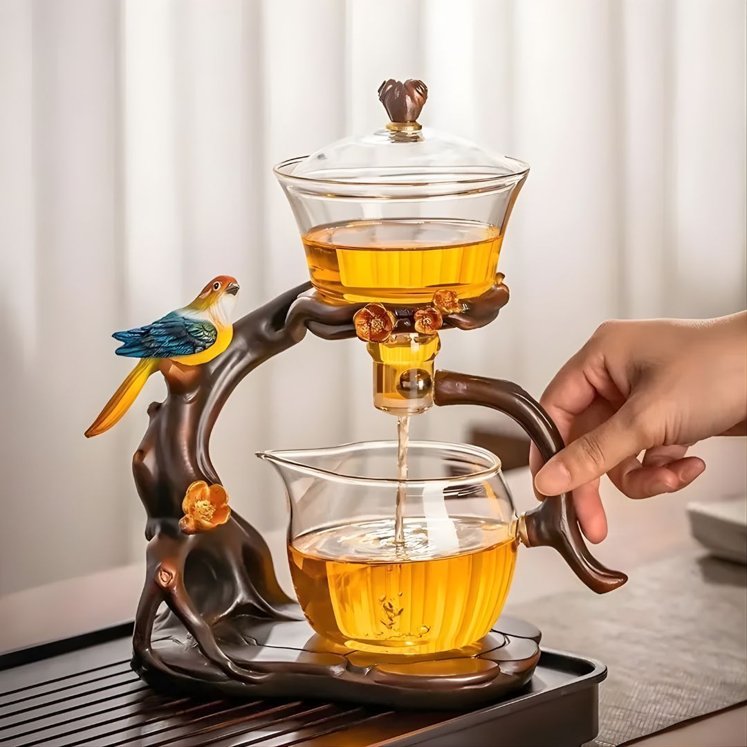 - Materiały: szkło (zaparzacz, dzbanek, pokrywki), poliżywica (dekoracyjna podstawa „Ptak na Gałęzi”).